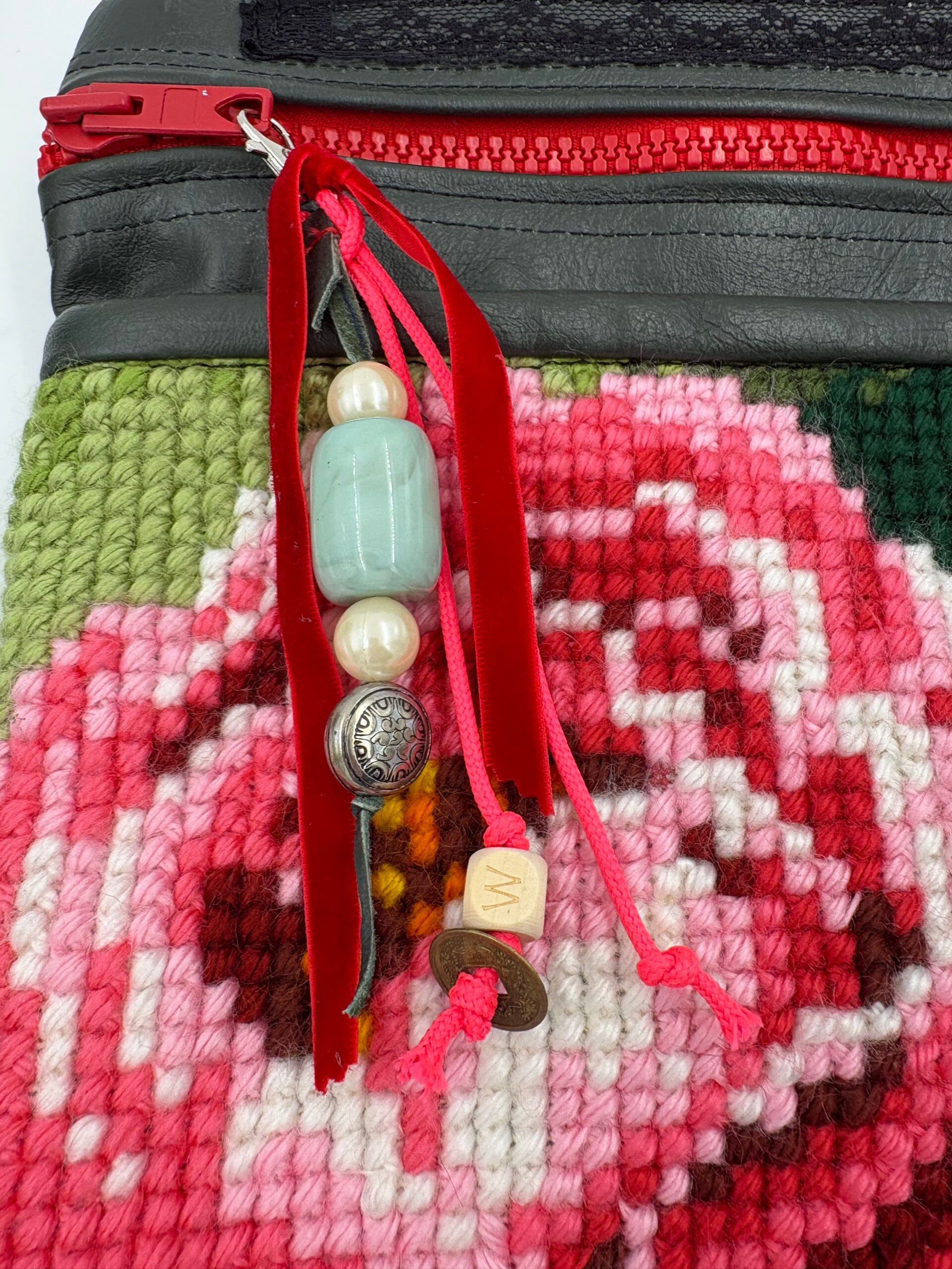 Rugzak groen leer met geborduurde roze rozen.
